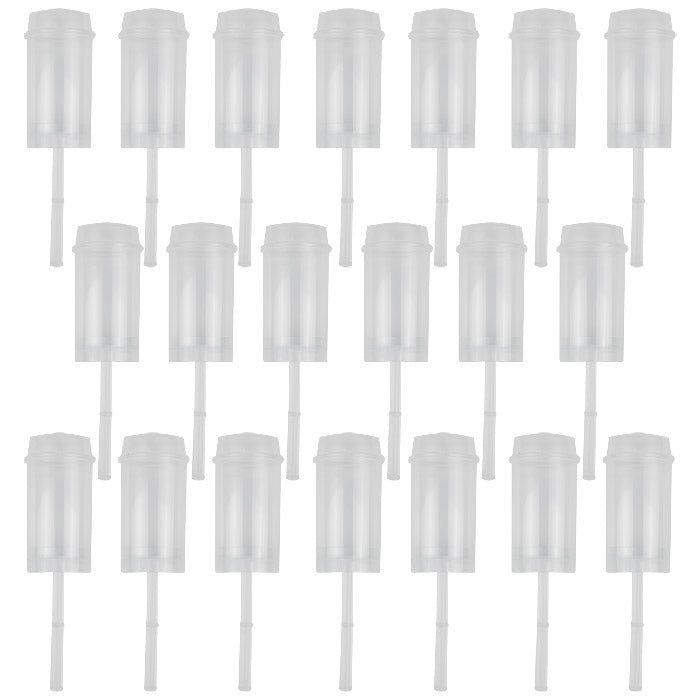 A pack of 20 empty and unbranded clear push-pops with plunger and lid. Ideal for filling with petal confetti, sweets or anything you can think of.