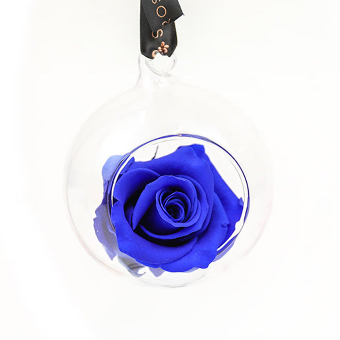 This preserved blue rose head comes delicately propped in an open-front bauble with a sleek satin ribbon, making it the ideal adornment for a Christmas tree, mantel display or, equally, just get creative – as with most of our products, they’re open to personal interpretation, and this product would nestle comfortably in the realm of gift or decoration.