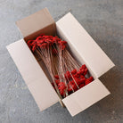 A box of 15 bunches of dyed red Achillea Parker, also known as Yarrow. This dried flower features clustered of beautiful flower heads, ideal for adding volume and colour to arrangements.