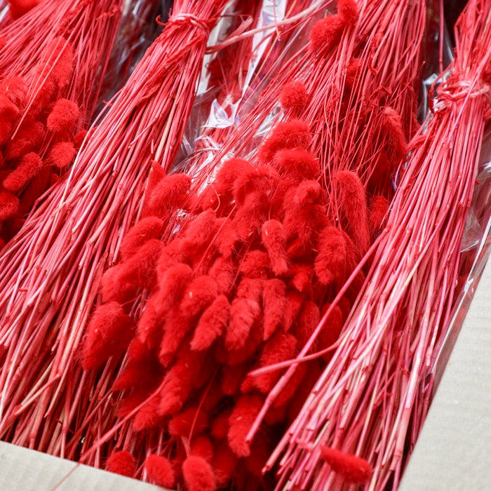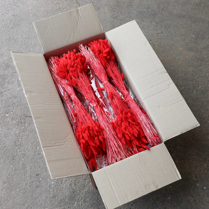 A box of bright dyed red Lagurus bunches at a volume of 25 bunches per box.