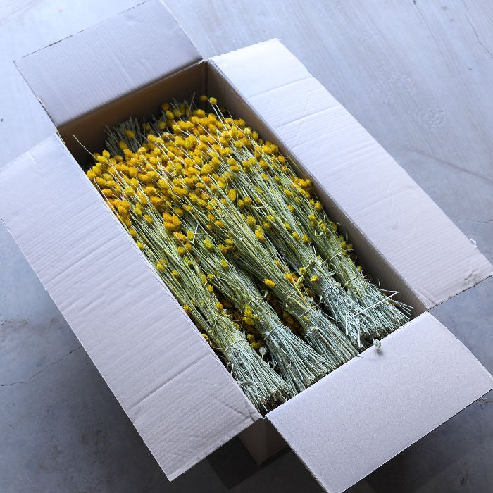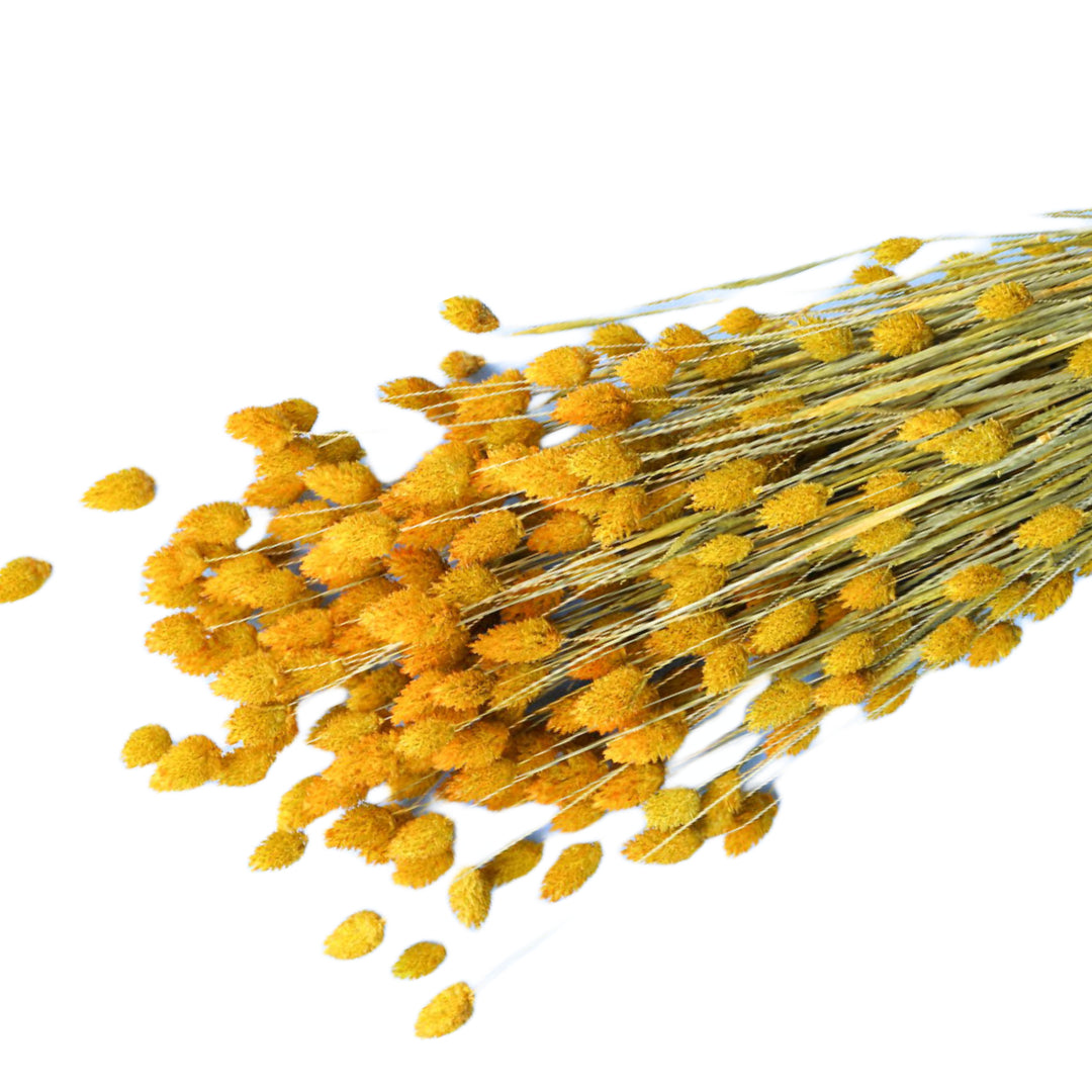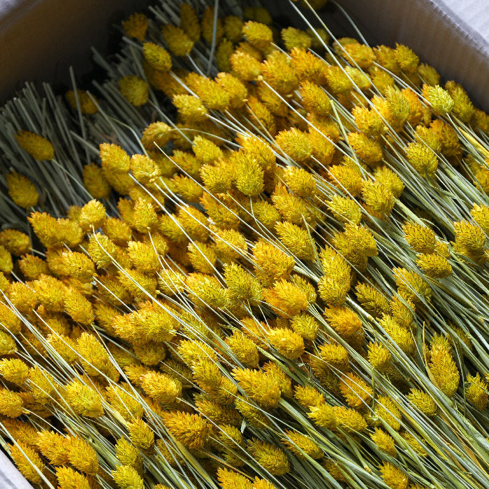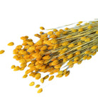 A lofty perennial species is also known as canary grass, this delightful Yellow Phalaris Bunch has been dyed a subdued, mustardy yellow that works just as well with natural tones as it does any contrasting vibrant element.