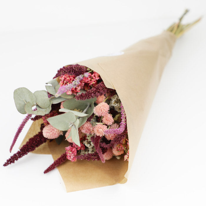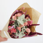 This sophisticated bouquet has been put together by hand with a range of long-lasting and low maintenance dried flowers. The dried flower bouquet has then carefully wrapped with kraft paper as a final touch to provide protection and customer appeal.