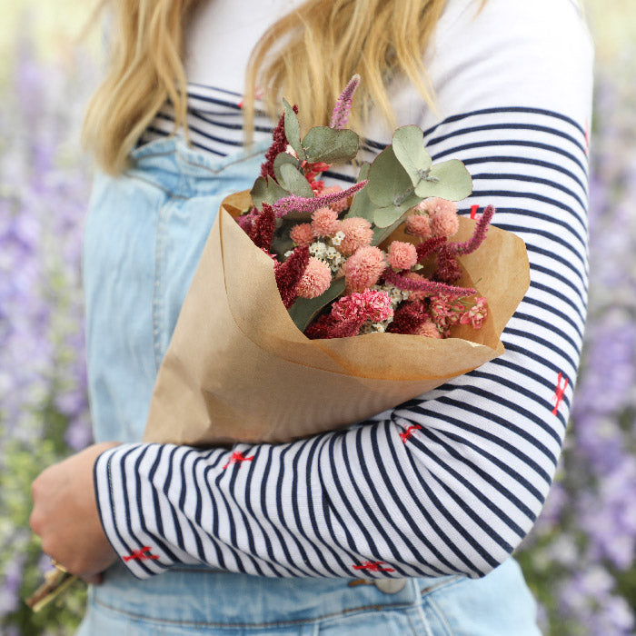 This dried floral bouquet includes a mixture of carefully selected natural dried flowers that complement one another, including larkspur, gomphrena, statice suworowii, eucalyptus and limonium. Some of the dried flowers have been grown on our Shropshire Farm, and some have been sourced, and dried onsite.
