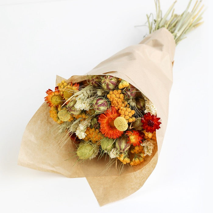 Handmade Autumnal Dried Flower Bouquet with stunning orange and yellows tones.
