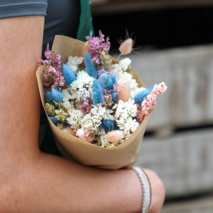 Handmade pastel dried flower bouquet, ready for the shop floor.