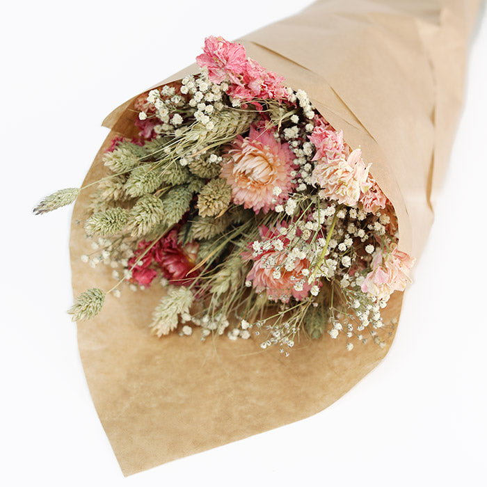 This pretty pink bouquet has been put together with a wonderful range of natural dried flowers that have all been grown on our flower farm in Shropshire. The dried flower bouquet has then carefully wrapped with kraft paper as a final touch.