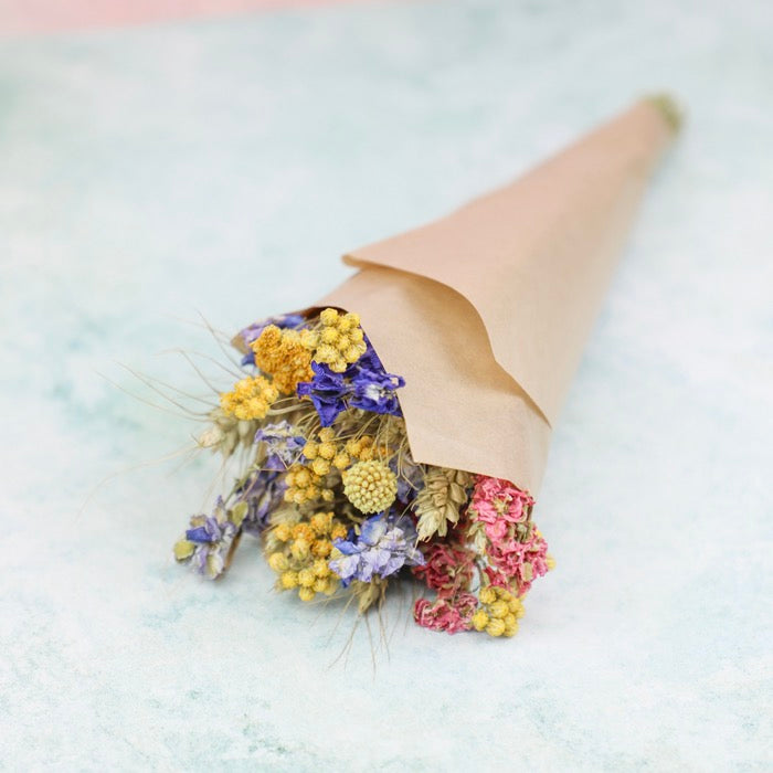 This pretty pastel bouquet has been put together by hand with a range of dried flowers, and variation is inherent, as each one is different. The dried flower bouquet has then carefully wrapped with kraft paper as a final touch to provide protection and customer appeal.