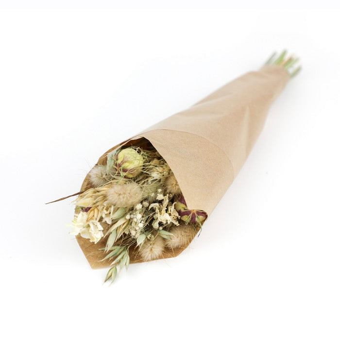 This pretty bouquet has been put together by hand with a range of dried flowers, and variation is inherent, as each one is different. The dried flower bouquet has then carefully wrapped with kraft paper as a final touch to provide protection and customer appeal.