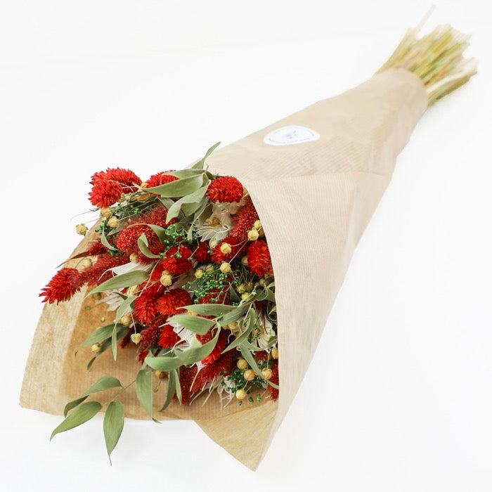 This dried floral bouquet includes a mixture of carefully selected natural dried flowers that complement one another, including Linum, Ruscus, bleached Nigella Orientalis, dyed green bloom broom, dyed Red Setaria and dyed Red Phalaris.