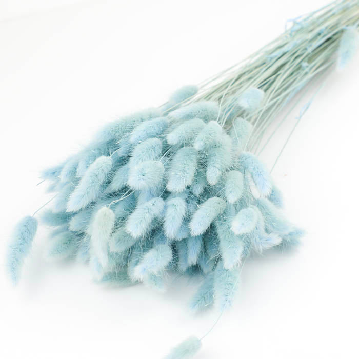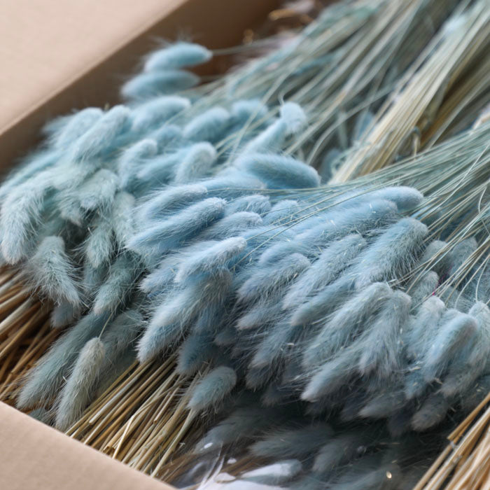 A bulk box of 25 x Dried Pastel Blue Lagurus Bunches (dyed). These dyed pastel blue Lagurus bunches are endowed with sweet, fluffy heads that are destined to add endless whimsy to any bouquet, floral display or crafting project.