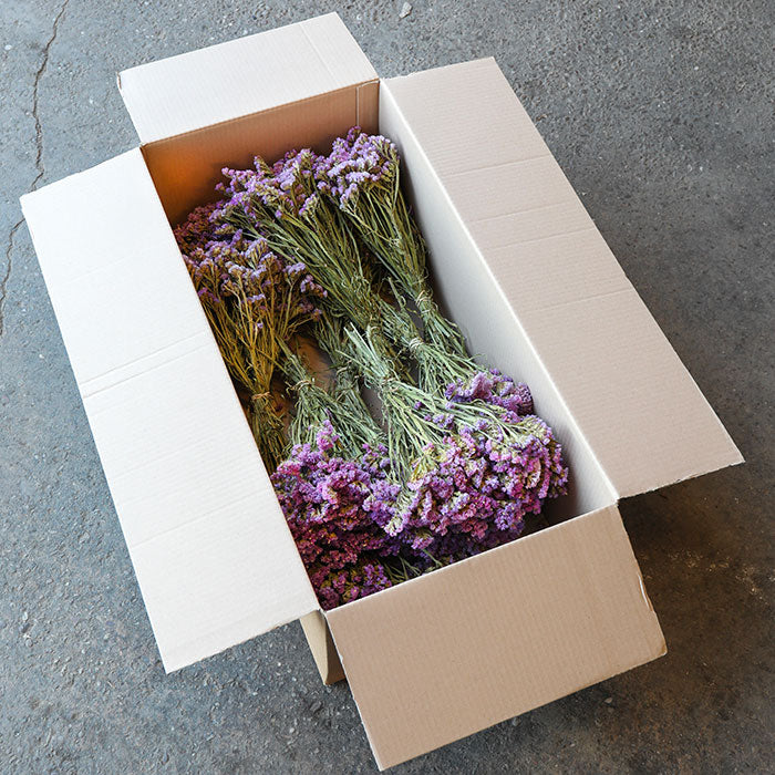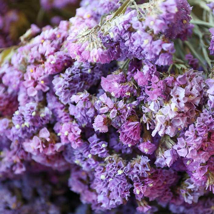 This dried lilac pink statice – otherwise known by its genus name Limonium sinuatum or more colloquial byname 'sea lavender' – has a dusky pink-purple undertone that gives it a lovely two-dimensional colour shift.