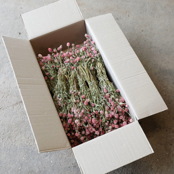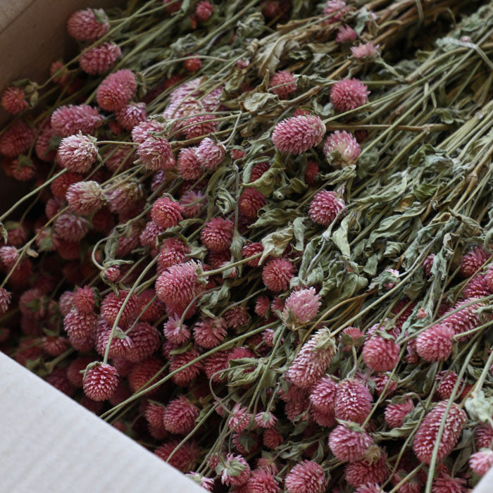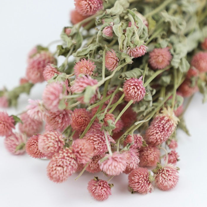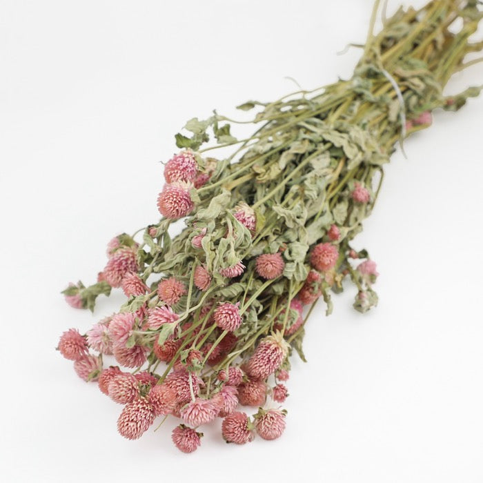 This pastel pink gomphrena bunch is more colloquially known as a globe amaranth. Its spherical blooms are its most charming feature; it looks just as good in a floral bouquet as it does in a vase of its own.
