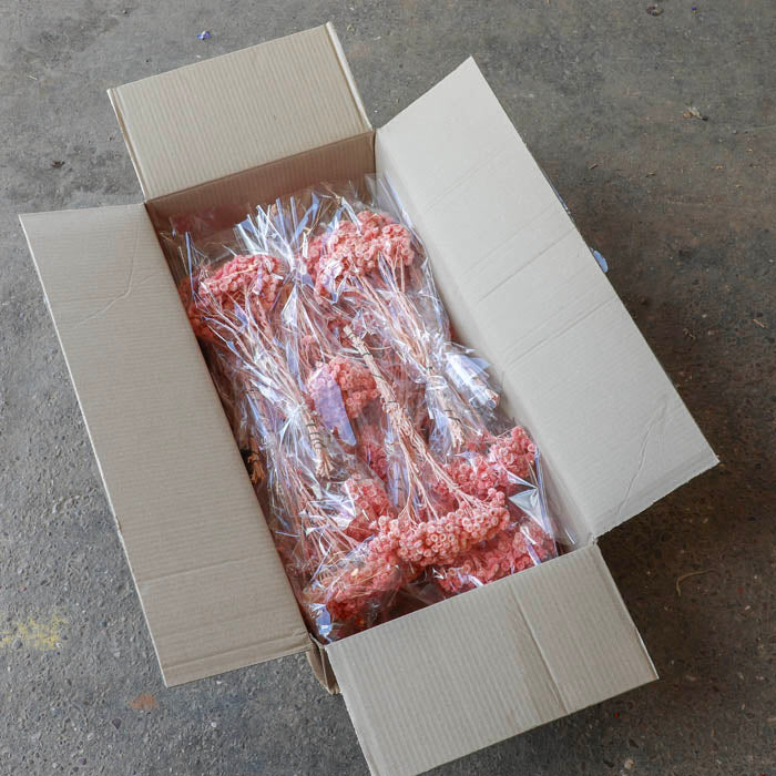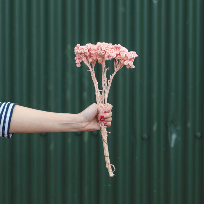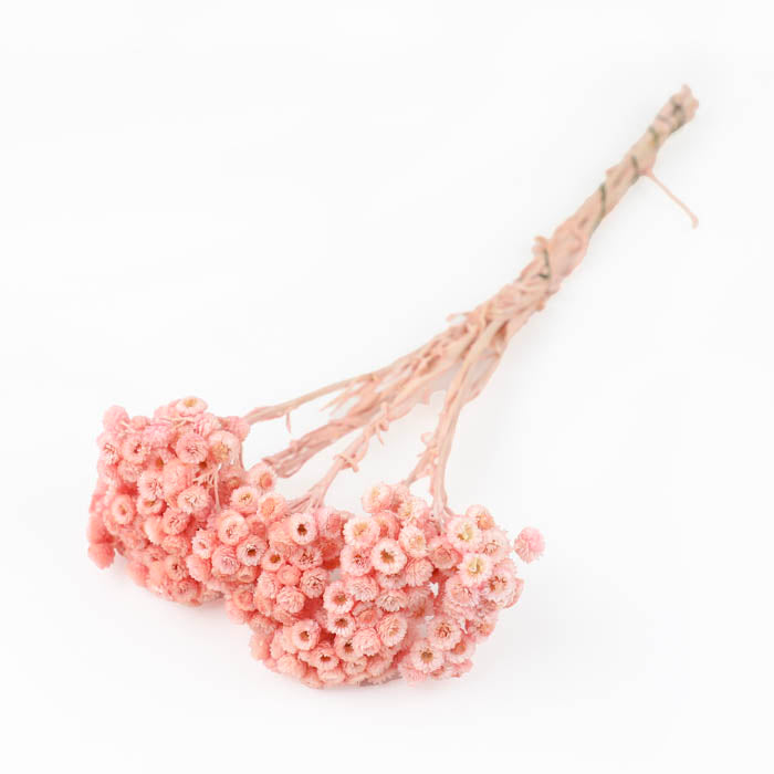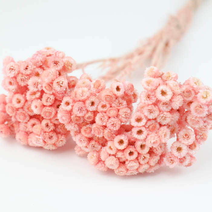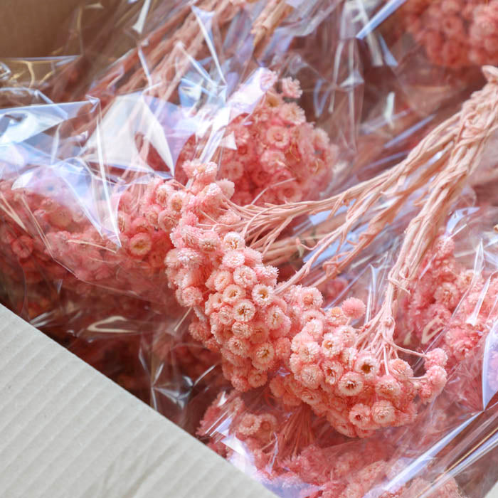 A dyed pink bunch of Helichrysum Immortelle, also known as a type of strawflower. This dried flower features large clusters of tiny beautiful flower heads.