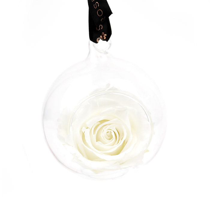 This preserved white rose head comes delicately propped in an open-front bauble with a sleek satin ribbon, making it the ideal adornment for a Christmas tree, mantel display or, equally, just get creative – as with most of our products, they’re open to personal interpretation, and this product would nestle comfortably in the realm of gift or decoration.