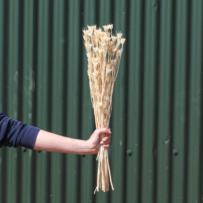A box of 15 dried Nigella Orientalis bunches. These bunches have been bleached in order for the natural pigments to fade, resulting in a lighter, brighter bunch to utilise in floral displays, wreaths, decorative wheat sheaves and for the purpose of crafting.
