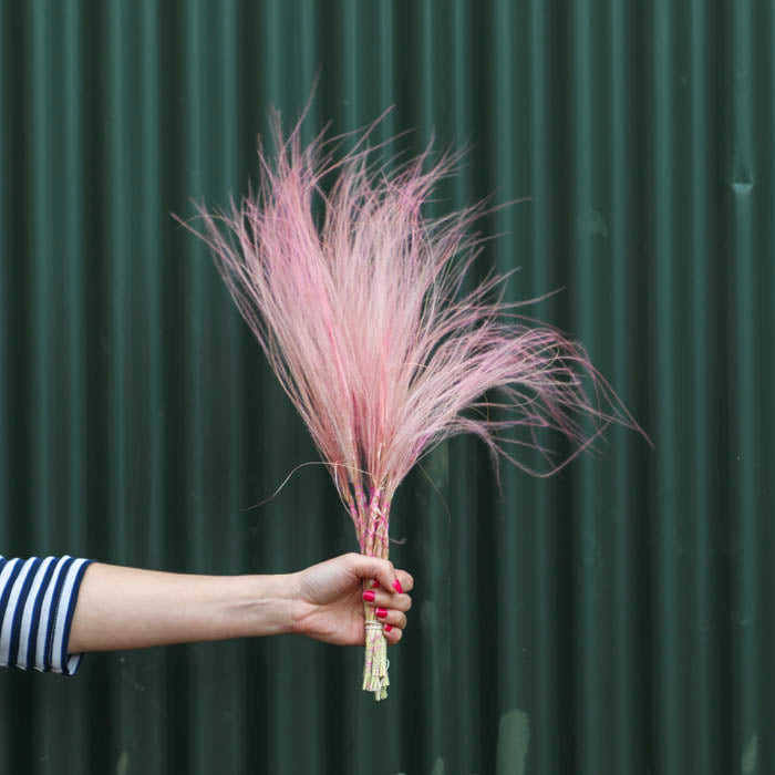 A bunch of dyed pink dried Feather Grass, also known as Stipa Pennata. These wispy dried grasses add movement in arrangements and displays due to their lightweight and airy nature.