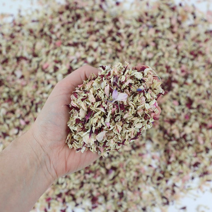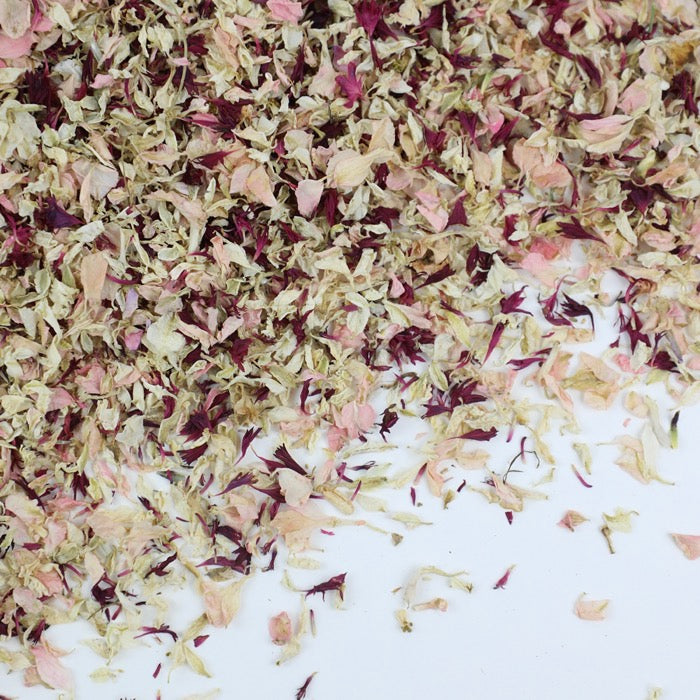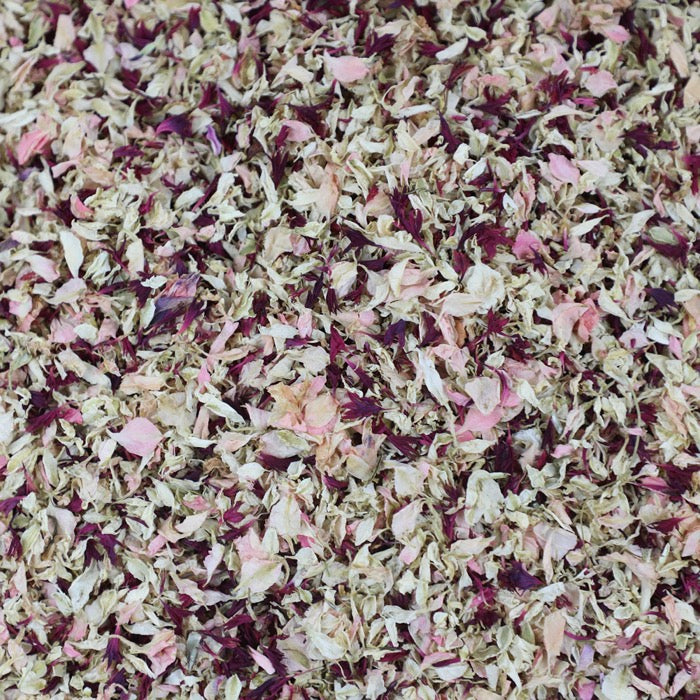 A blend of dried burgundy cornflower petals with pastel pink and ivory delphinium/larkspur petals. These petals are a mix of smaller seconds petals offered at a competitive price.