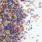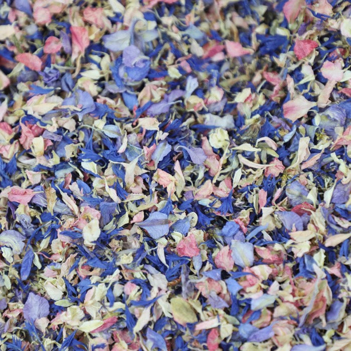 A blend of dried rich purple, bright pink and ivory delphinium/larkspur petals, along with blue cornflower petals. These petals are a mix of smaller seconds petals offered at a competitive price.