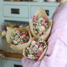 Handmade pink dried flower bouquet, ready for the shop floor. These long-lasting bouquets are ideal gifts for seasonal occasions like Valentines, birthdays or anniversaries.