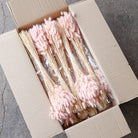 A box of pastel pink dyed Lagurus bunches at a volume of 25 bunches per box.