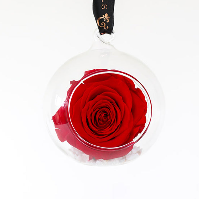 This preserved red rose head comes delicately propped in an open-front bauble with a sleek satin ribbon, making it the ideal adornment for a Christmas tree, mantel display or, equally, just get creative – as with most of our products, they’re open to personal interpretation, and this product would nestle comfortably in the realm of gift or decoration.