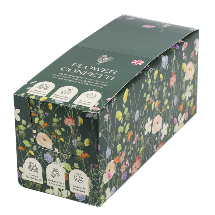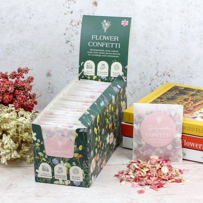 A box of 25 eco-friendly confetti sachets, filled with biodegradable flower confetti grown and handpicked on our Shropshire farm.