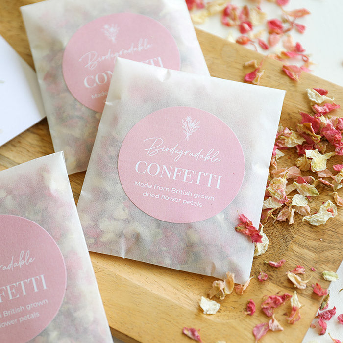 Our bestselling pink biodegradable confetti sachets are filled with a feminine mix of ivory, dusky pink and rich pink dried delphinium petals.