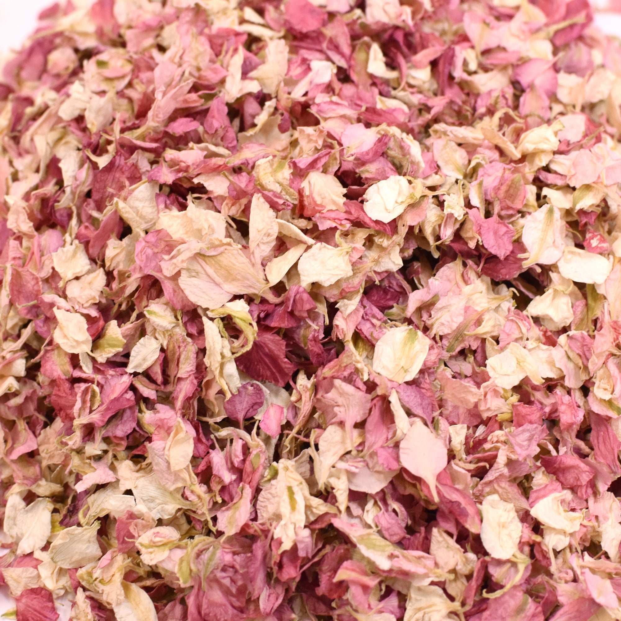 Dried myriad of hot pink, pastel pink and ivory Delphinium/Larkspur Petals which are 100% biodegradable, natural and eco-friendly with no added dyes. Grown, hand picked and dried on our Shropshire Flower Farm.