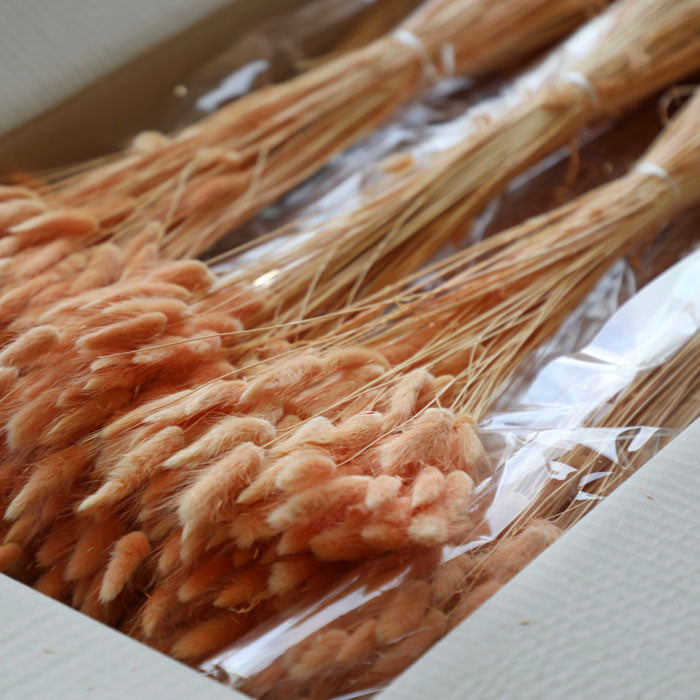 A bulk box of 25 x Dried Peach Lagurus Bunches (dyed).