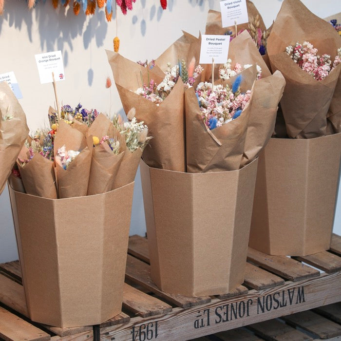 - Ideal display for 6 standard dried flower bouquets or 12 mini dried flower bouquets