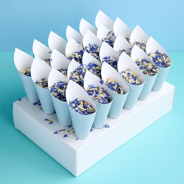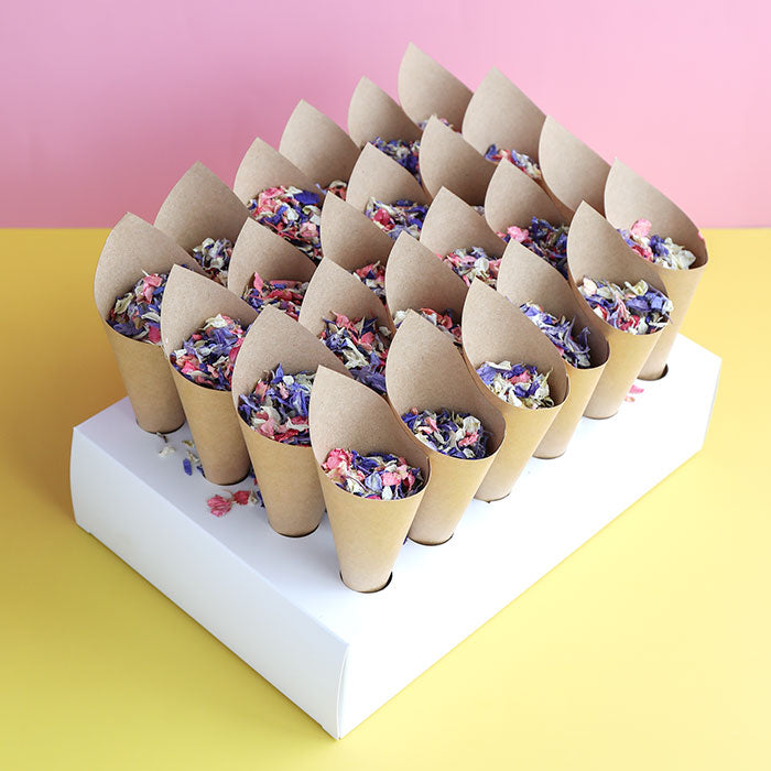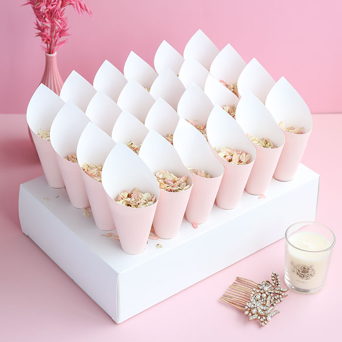 An Unbranded Confetti Cone Tray with 24 cones and 2.4 litres of petals to fill each cone.