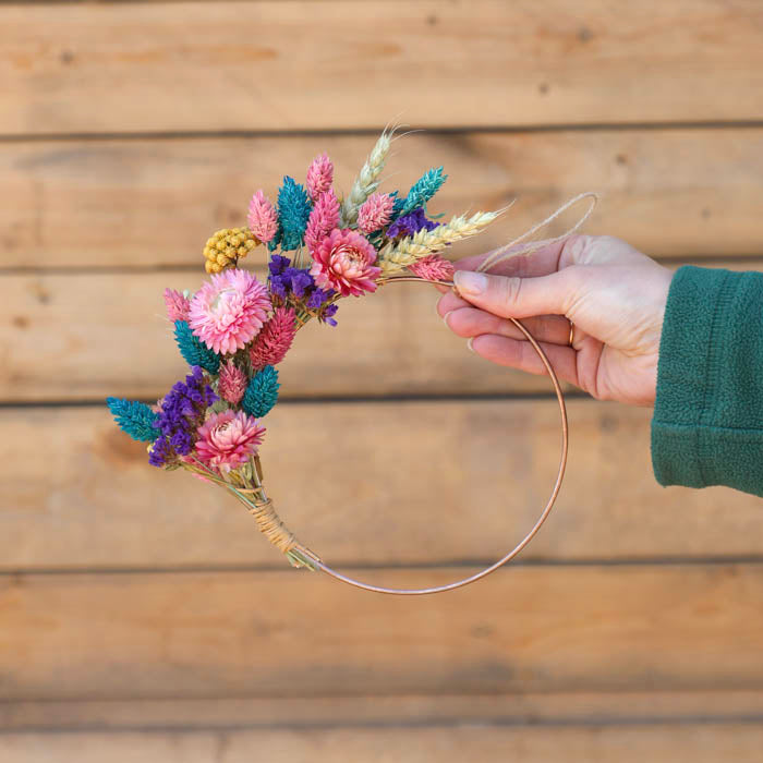 Summer Edition MINI DIY Dried Flower Wreath Kit. Ideal gifting for someone that loves to get crafty. Featuring bright pink, blue, purple, yellow and golden dried flowers. This kit is the perfect price point for an impulse purchase.