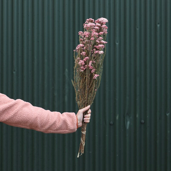 A bunch of pink dried rice flowers, also known as Helichrysum diosmifolius or Ozothamnus diosmifolius.