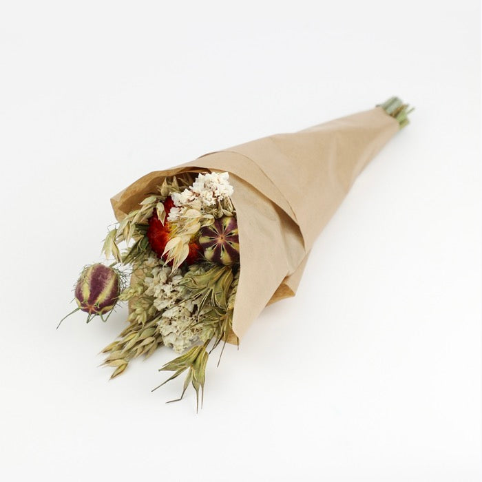 This pretty bouquet has been put together by hand with a range of dried flowers, and variation is inherent, as each one is different. The dried flower bouquet has then carefully wrapped with kraft paper as a final touch to provide protection and customer appeal.