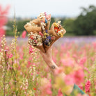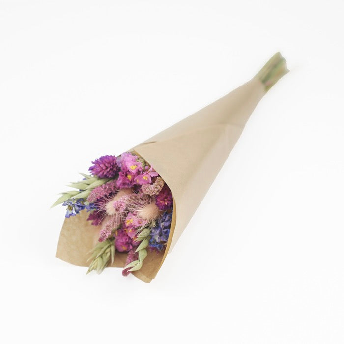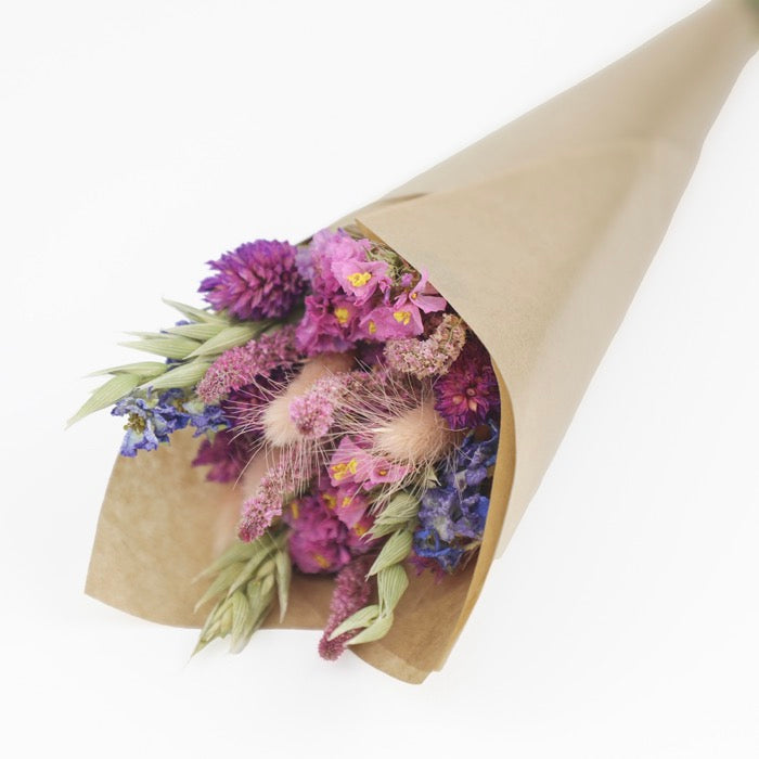 This pretty bouquet has been put together by hand with a range of dried flowers, and variation is inherent, as each one is different. The dried flower bouquet has then carefully wrapped with kraft paper as a final touch to provide protection and customer appeal.